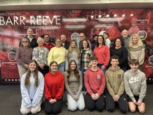 Left: PHOTO CAPTION   Our Community Foundation presented a grant to the Barr Reeve Schools Choir. Shown during the grant presentation are (left to right) – BR Music Students Ava Shake, Payton Bezy, Emma Hamm, Asher Stoll, Lincoln Stoll, and Finn Gardner. 2nd Row: Carol Nugent, OCF Board; Paula Jones, OCF Board; Amanda Qualkenbush, Malin Qualkenbush, Laurel Wagler, Ms. Misty Mosby, BR Music Director; Chasity Matthews, OCF Board; Chris Jarrett, OCF Executive Director; 3rd Row: Jeff Doyle, BR Principal; Travis Schaffer, OCF Board President; Chance Berry, OCF Board VP; Marlin Wagler, Joshua Wagler, Leighton Wagler, Joe Singleton, OCF Board Member.
